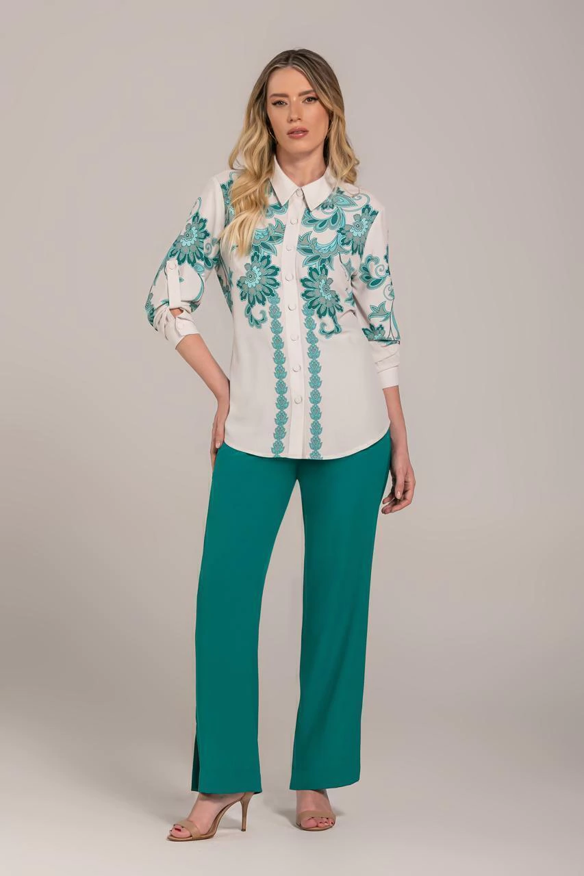 Essa camisa em crepe traz sofisticação e leveza para os looks do dia a dia. Com estampa exclusiva no estilo folk em tons de verde sobre fundo off-white, o modelo valoriza a silhueta com elegância. As mangas com detalhe de abotoamento e o tecido fluido garantem conforto e charme em todas as ocasiões.